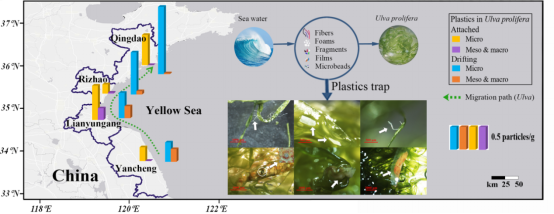 微塑料通常指粒径小于5 mm的塑料污染物,由于其易分散和易被生物摄取等特点已经成为全球海洋污染研究的热点。此外,绿潮作为全球海洋频繁发生的生态环境事件,也一直是世界学者关注的焦点。我国黄海海域自2007年以来每年都会发生由浒苔引起的绿潮,最大分布面积达到近60,000平方千米,重量约2000万吨。原位监测结果发现漂浮状态和固着状态的浒苔都可以通过多种机制富集大量微塑料,包括缠绕、附着、嵌入和包裹,漂浮浒苔中微塑料的丰度比海水中微塑料的丰度高595-3917倍;漂浮的浒苔还会影响海洋中塑料的时空分布,并且沿黄海从南到北的漂流路径浒苔中微塑料的丰度逐渐增加;室内毒理实验结果表明,基于其对微塑料的强富集能力和高耐受性,大型海藻具备成为应对近海微塑料污染生物材料的潜在能力。随着海洋微塑料污染的日益加剧和大型海藻有害藻华的频繁发生,海洋微塑料与大型海藻有害藻华的相互作用需要更多的关注。此研究为同时应对这两大全球性挑战提供了新的见解。