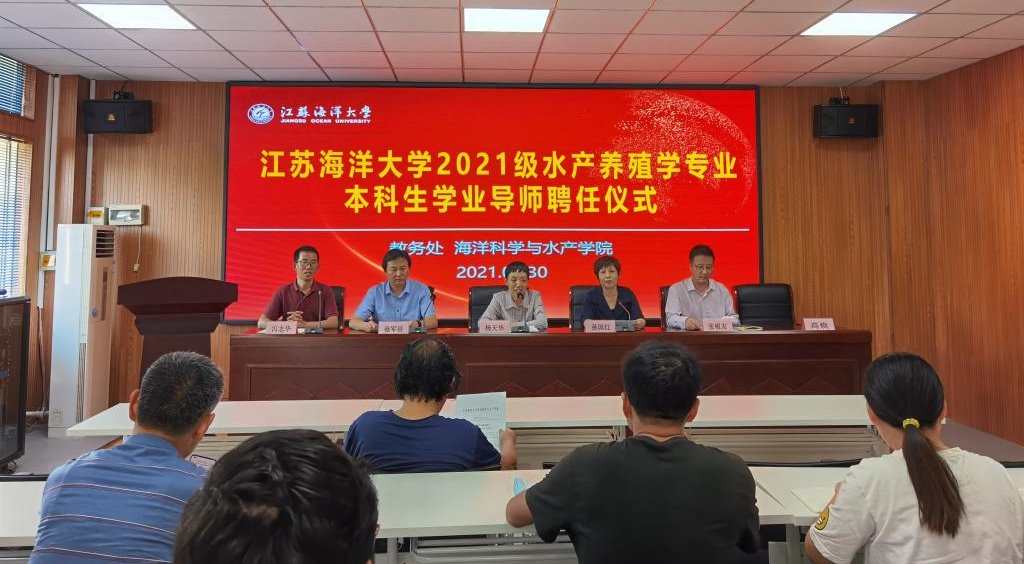孙国红宣读了《关于聘任江苏海洋大学2021级水产养殖学专业本科生学业导师的决定》,孙国红、杨天华、徐军田共同为23位学业导师颁发了聘书。